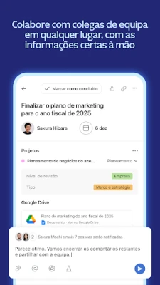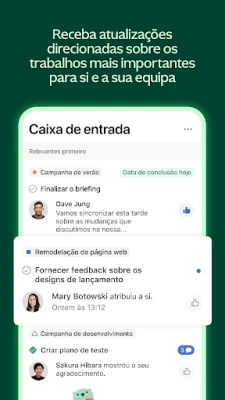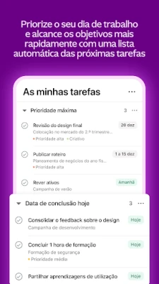 Para impulsionar a sua produtividade individual, a seção "Minhas Tarefas" reúne em um único local todo o trabalho atribuído a você, facilitando a visualização e o gerenciamento. Priorize suas atividades sem esforço, arrastando e soltando tarefas entre seções preexistentes ou criando novas divisões personalizadas, e ordene-as conforme os atributos que mais importam. Mantenha-se conectado e colaborativo em tempo real: comunique-se com seus colegas de equipe através de comentários diretos, reações ou anexando arquivos relevantes às tarefas. Sua Caixa de Entrada inteligente garante que você receba atualizações automáticas sobre os projetos e tarefas que são cruciais para você, assegurando que nada passe despercebido.