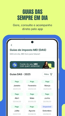 Com a MaisMei, a gestão fiscal e financeira está ao seu alcance. A Central de Obrigações permite visualizar guias DAS (vencidas ou a vencer), copiar códigos de barras e realizar pagamentos com agilidade. Obtenha orientações claras para a Declaração Anual de Faturamento (DASN), evitando erros e multas. Para profissionalizar suas transações, nosso Emissor de Notas e Recibos possibilita gerar Notas Fiscais de Serviço (NFS-e) no padrão nacional em poucos cliques, além de criar recibos de pagamento em PDF/Imagem para compartilhar com seus clientes.